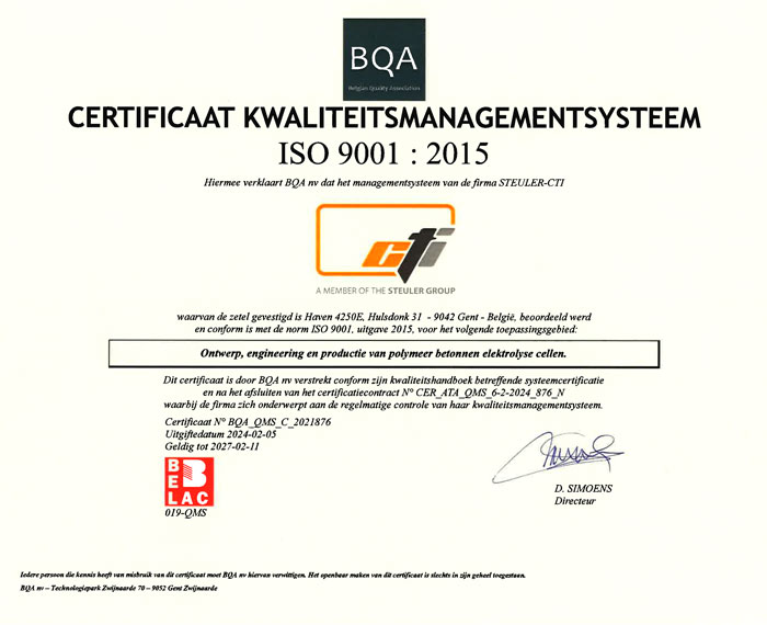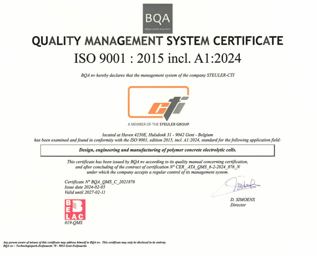 ISO 9001:2015 – covering the design, engineering, and manufacturing of our polymer concrete electrolytic cells, this certification ensures that every step of our process follows the highest standards of quality management and continuous improvement.