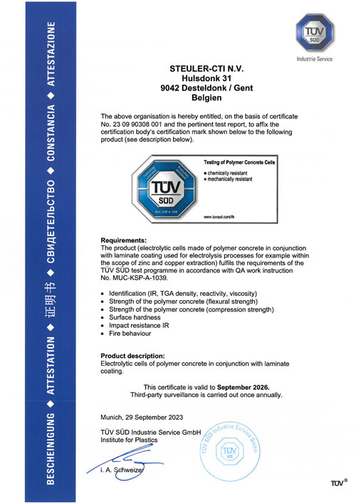 TÜV Certification – awarded for our electrolytic cells of polymer concrete in conjunction with laminate coating, this independent technical approval confirms that our products meet the highest requirements for safety, reliability, and performance.